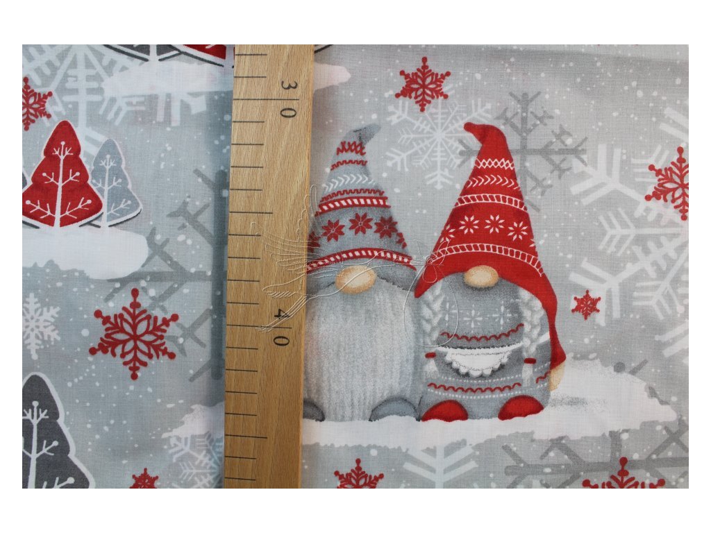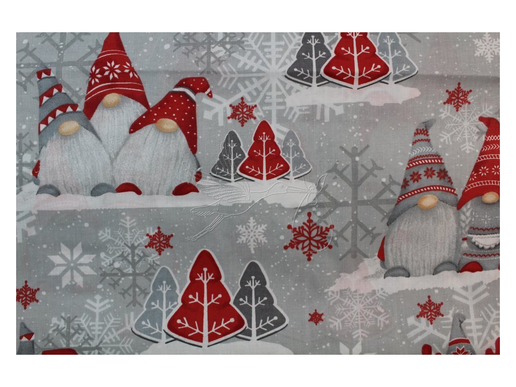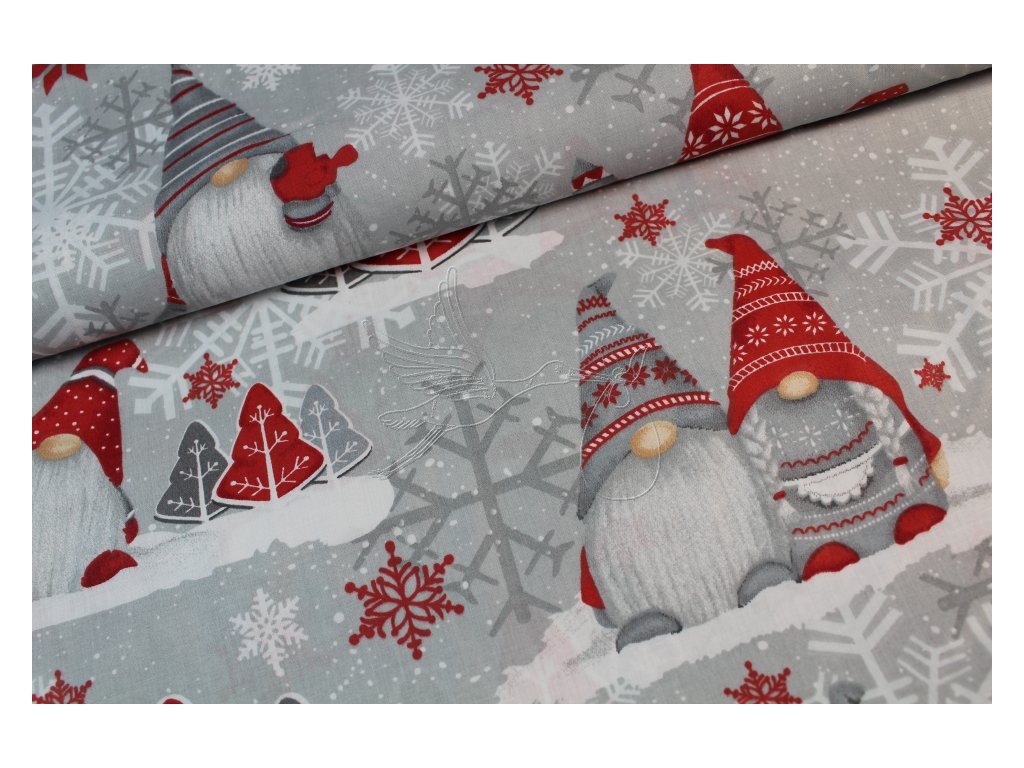 100% bavlněné plátno se skřítky na šedé.