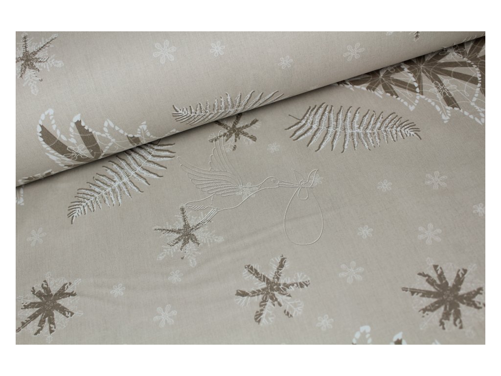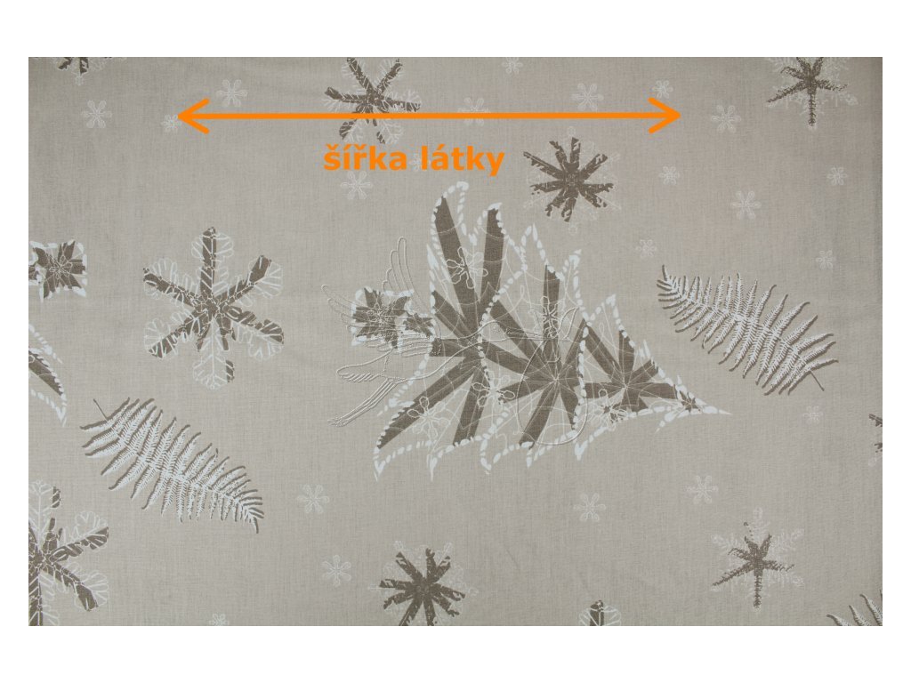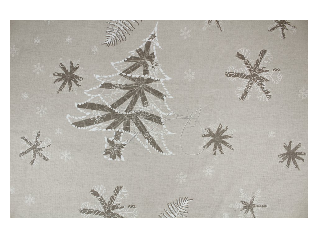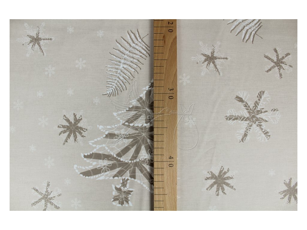 Krásně jemné plátno se vzorem vánočních stromečků, vloček a větviček.